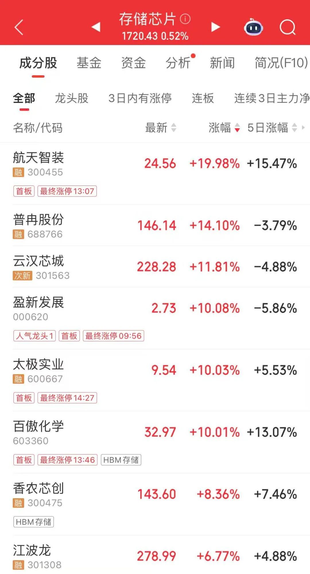 午后,存储芯片概念股走强,太极实业等股票涨停,香农芯创涨幅超8%,股价再创历史新高。