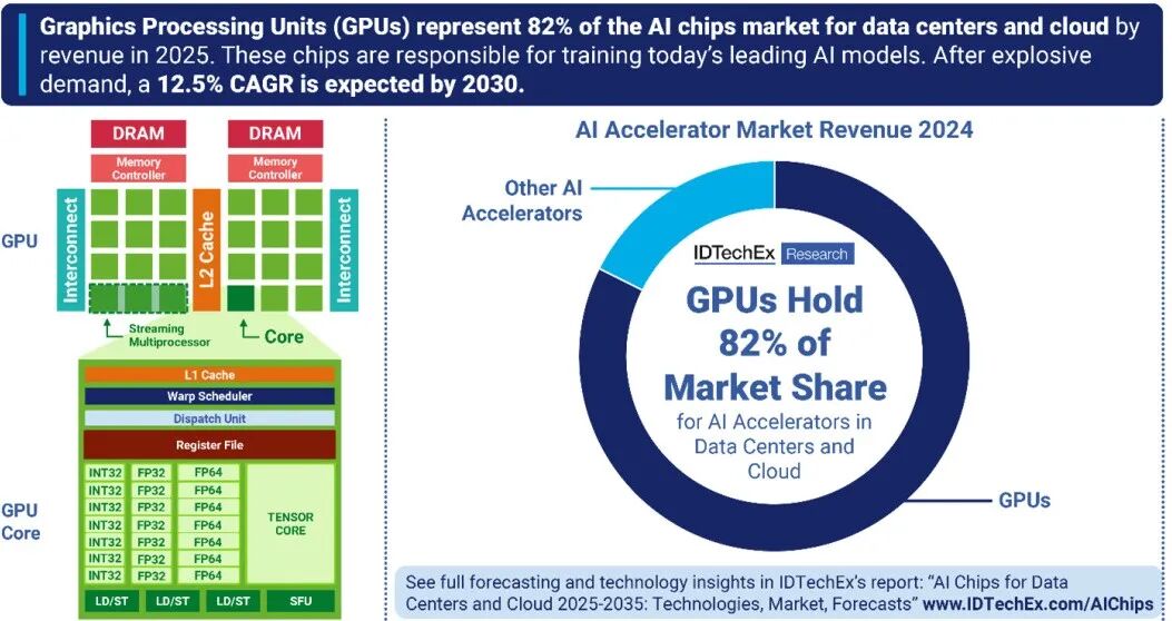 IDTechEx报告称,2024年,GPU占据了AI芯片总营收的82%;2025年,预计GPU将迎来新一轮大幅增长。