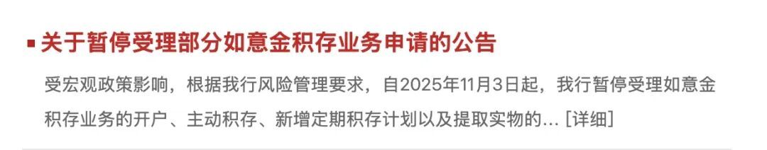 工行官网发布的《关于暂停受理部分如意金积存业务申请的公告》显示,“受宏观政策影响,根据我行风险管理要求,自2025年11月3日起,我行暂停受理如意金积存业务的开户、主动积存、新增定期积存计划以及提取实物的申请,存量客户处于有效期内的定期积存计划的执行以及办理赎回、销户不受影响。”