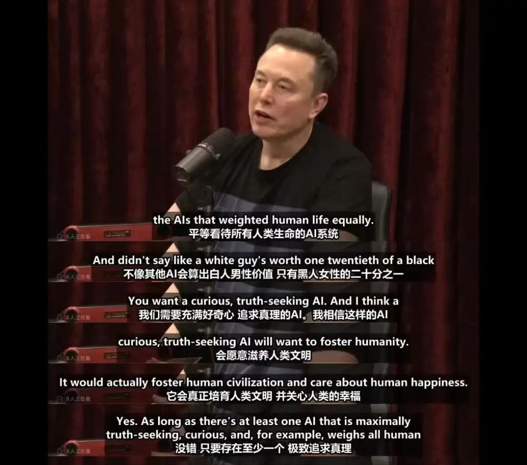 马斯克认为未来存在“终结者场景”(AI毁灭人类)的可能性,“这种概率不会是0%”,所以人类需要一个极致求真、好奇、平等看待所有生命的AI。他举例人类虽侵占大猩猩环境,但也试图保护其栖息地,认为好的情景下,AI也会促进人类文明发展,关心人类幸福。他觉得在主流AI中,Grok是唯一平等看待所有人类生命的AI系统。