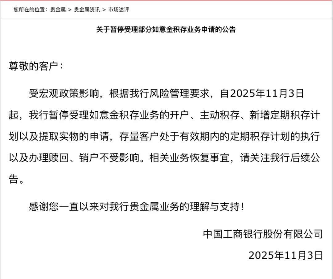 工商银行公告称,受宏观政策影响,根据该行风险管理要求,自2025年11月3日起,工商银行暂停受理如意金积存业务的开户、主动积存、新增定期积存计划以及提取实物的申请,存量客户处于有效期内的定期积存计划的执行以及办理赎回、销户不受影响。