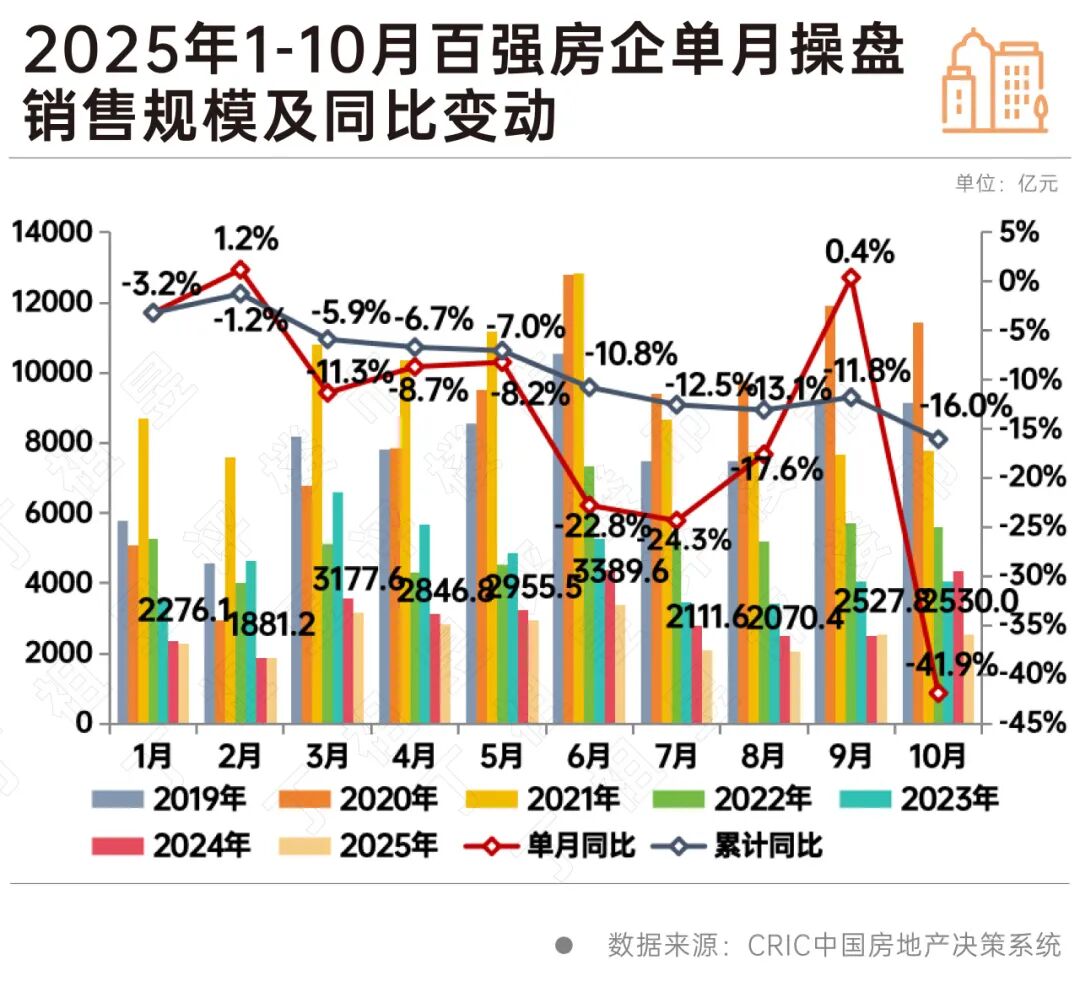 2025年10月,TOP100房企实现销售操盘金额2530亿元,环比增长0.1%,同比减少41.9%。累计业绩来看,百强房企实现销售操盘金额25766.6亿元,同比减少16%,降幅相较于前9月扩大4.2个百分点,仍为2019年至今最低位。