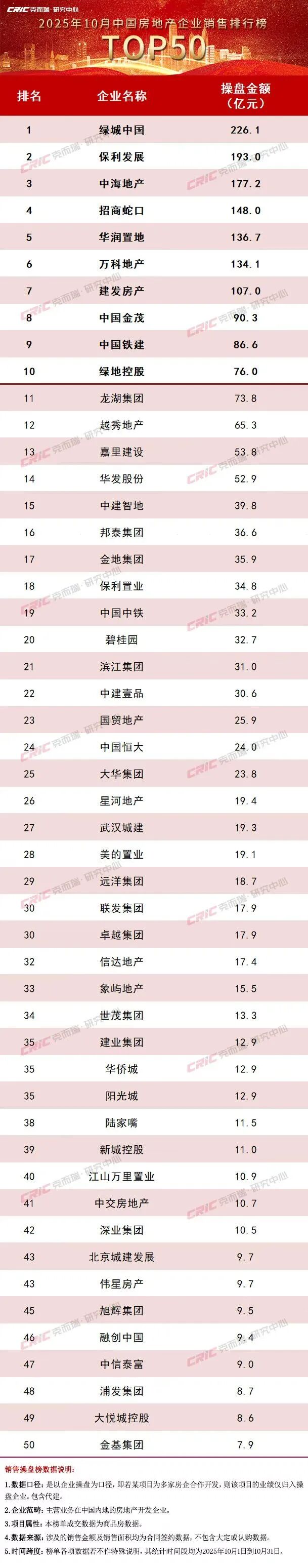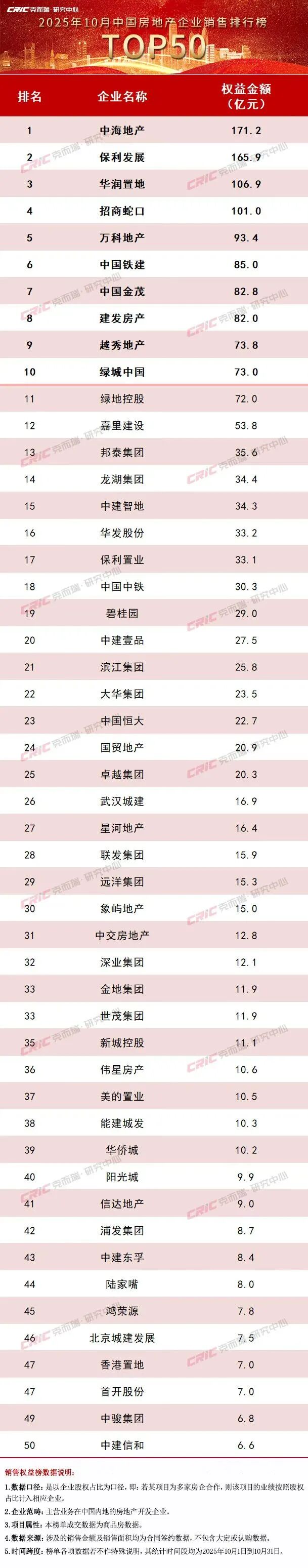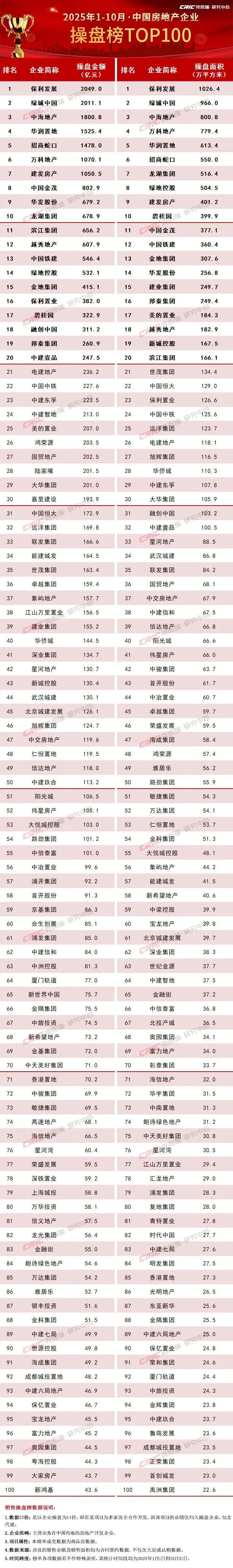 附:2025年10月中国房地产企业销售排行榜