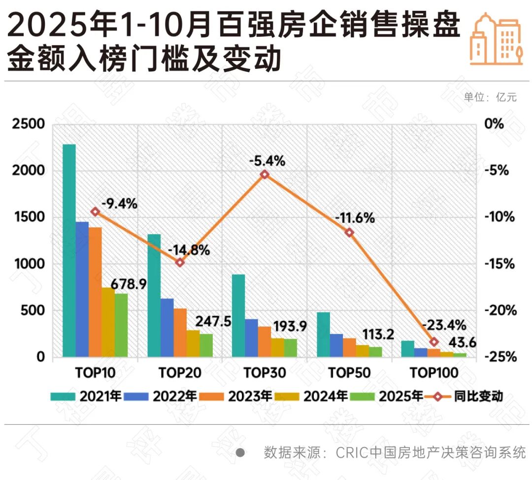 从TOP100房企各梯队销售门槛来看,2025年10月,门槛值均已降至2021年至今最低水平。