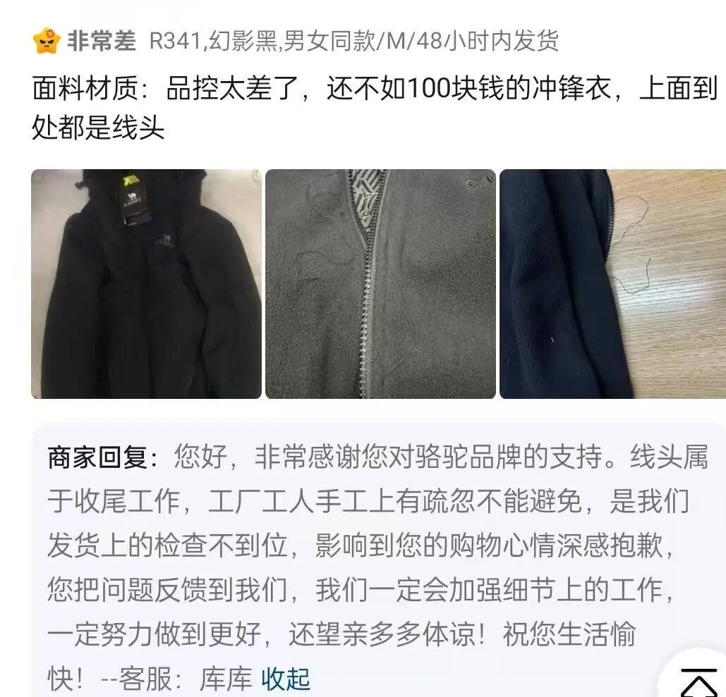 有用户直言:“品控太差了,还不如100块钱的冲锋衣,上面到处都是线头”,字里行间满是对产品质量的失望。