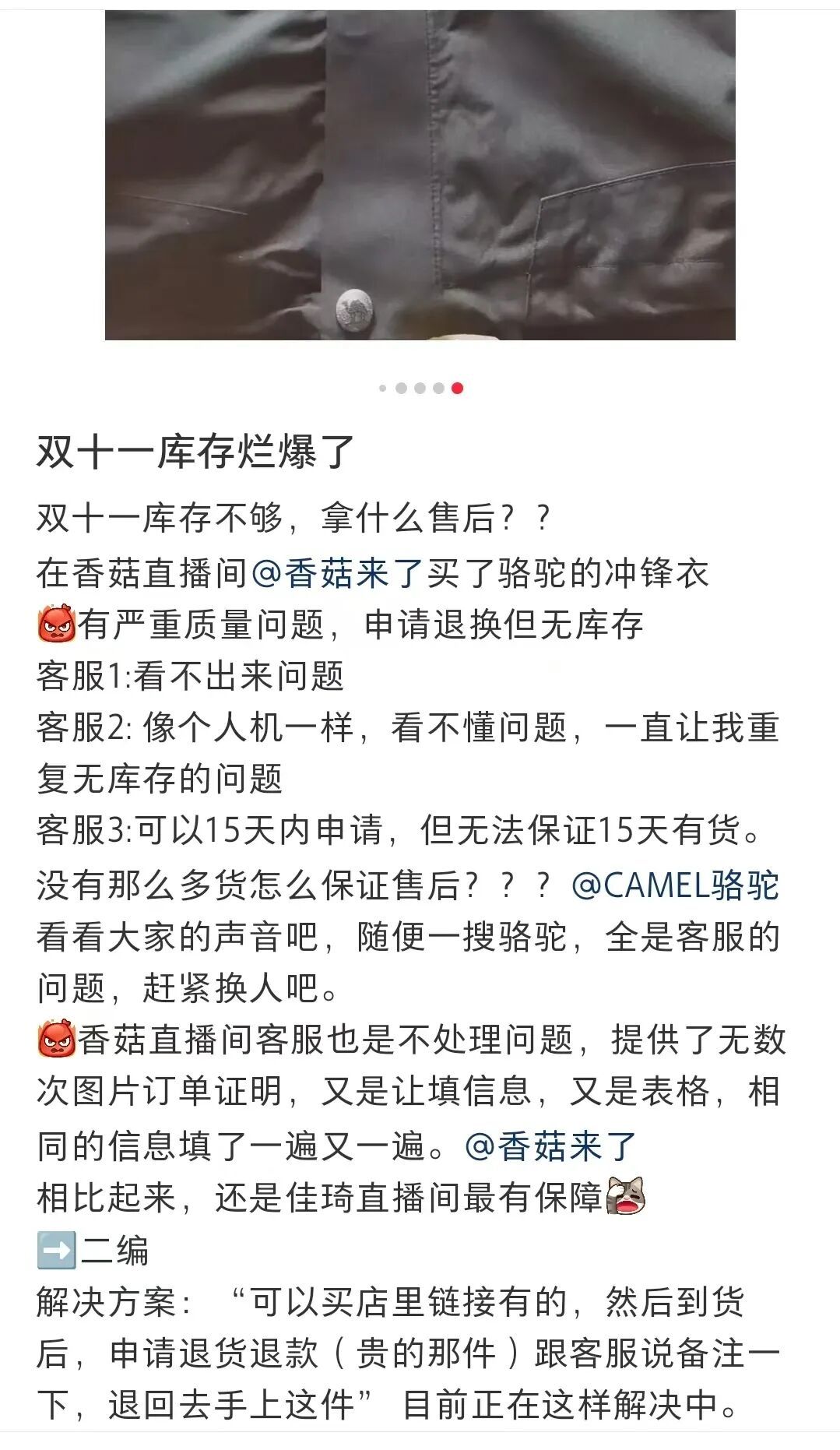 更值得注意的是,这些负面反馈不仅散见于社交平台,就连骆驼官方旗舰店的评论区里,也能看到类似吐槽。