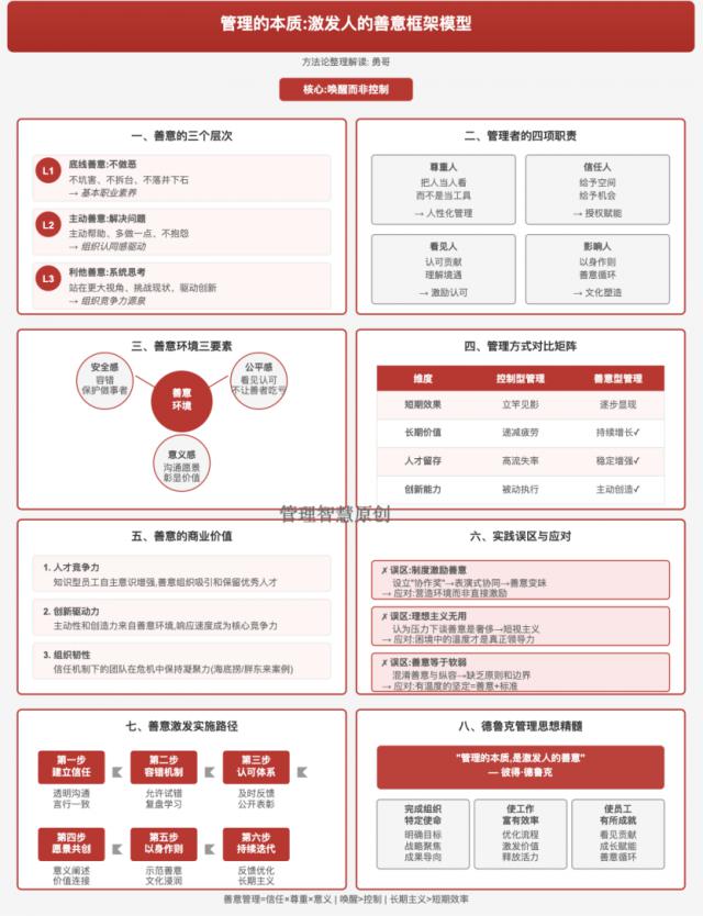 德鲁克指出,管理的本质是激发人的善意。管理并非让机器更快运转的学问,而是让人与人之间的协作更有意义的艺术。在当下商业环境中,人们常谈KPI、ROI、组织效率和战略执行,善意似乎显得不合时宜。然而,缺乏善意,所有制度、激励和文化建设最终都会走样。