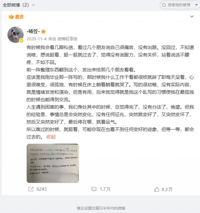 此外,杨笠的微博账号也仅1条动态可见,为2020年发布。