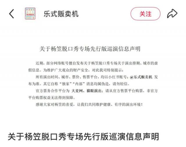 同日,“乐式贩卖机”发布关于杨笠脱口秀专场先行版巡演信息声明。部分内容如下:近期,部分网络账号擅自发布关于杨笠脱口秀专场关于演出排期、城市的虚假信息。为维护广大观众的财产安全,对此,我司特别提示:所有演出时间、城市、票价、售票平台,均以小红书账号“乐式贩卖机”发布为准。其它自称“独家”“内部”消息均属伪造,请勿轻信。官方票务合作平台为大麦网、猫眼演出;请从官方售票平台购票,非官方平台购票权益无法得到保障,感谢大家对杨笠的喜爱,让我们共同维护健康、有序的演出环境!