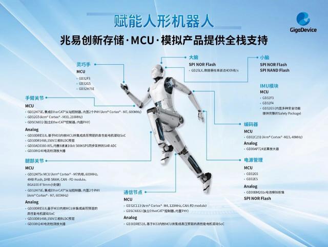 作为机器人的“小脑”和“神经末梢”,MCU承担着电机控制、传感器数据处理、实时通信等核心功能,是实现人形机器人灵活运动不可或缺的部分。在这一领域,兆易创新凭借其在MCU、存储和模拟芯片方面的全栈布局,正成为人形机器人产业化的重要推动者。