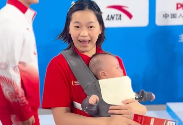 11月2日,全红婵助力广东队夺得全运会跳水女团冠军。1天后,她现身男团比赛现场,不过这次不是参赛,而是帮参赛的谢思埸带娃。