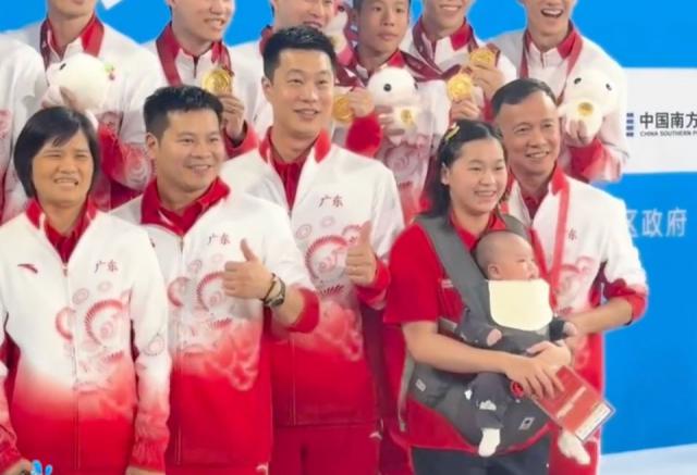 广东男团夺冠后拍冠军照,全红婵抱着孩子也加入其中。之后,全红婵还和谢思埸的妻子一起合影,两人关系十分融洽。