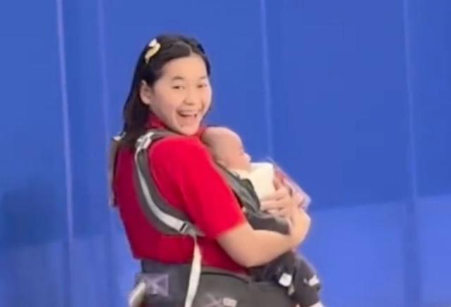 谢思埸参赛时,全红婵主动承担起带娃任务。她细心地把宝宝抱在怀里,托抱动作规范,还不时给宝宝整理衣角,动作轻柔,神情专注,网友纷纷赞她成功化身“全姨”。