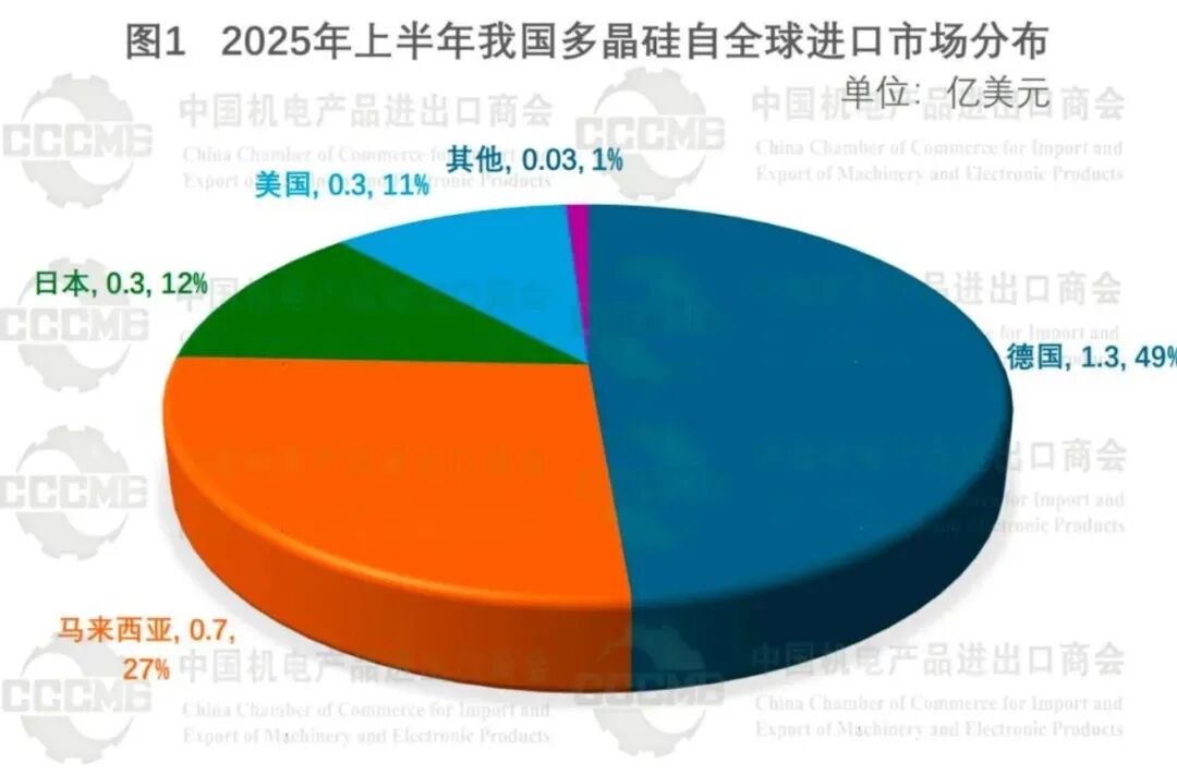 相较于光伏产品出口,我国进口商品集中于多晶硅这类光伏上游原材料产品,规模小得多,且主要进口来源地为德国、马来西亚、日本、美国,不包含印度。