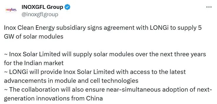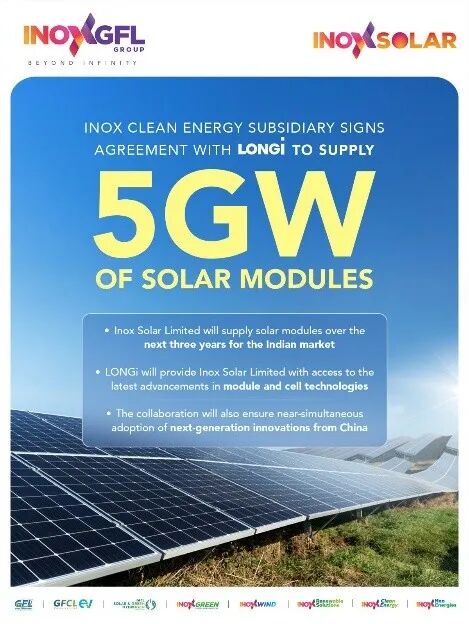 隆基绿能是中国的全球性太阳能科技公司,Inox Solar是印度本土光伏制造企业,隶属于Inox GFL集团。