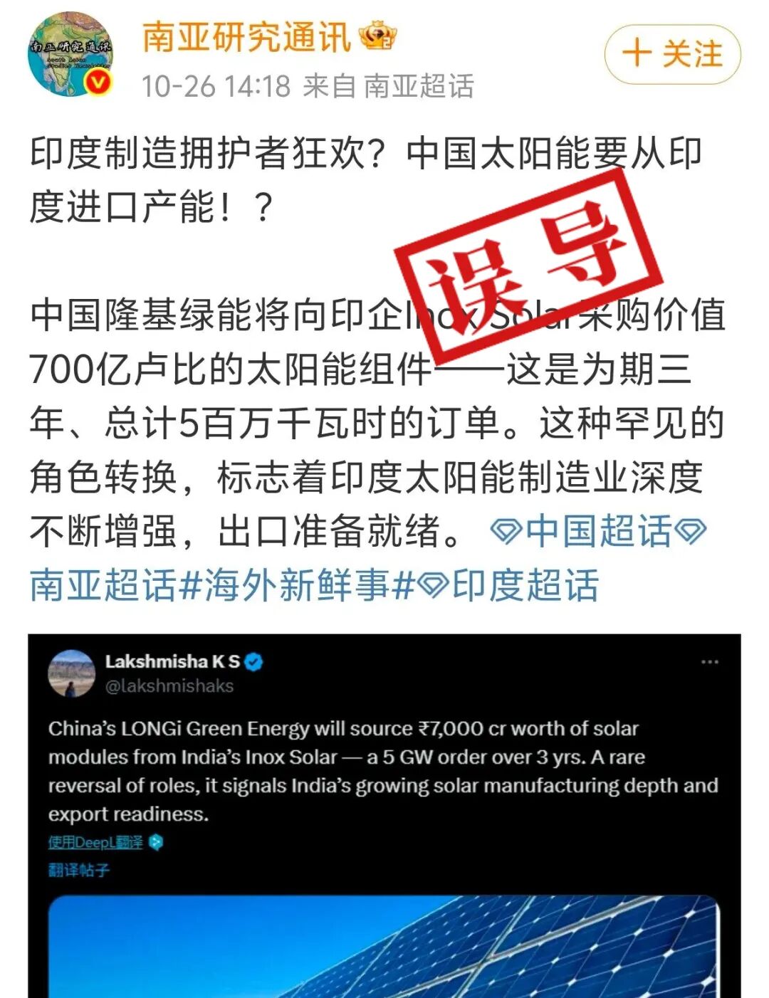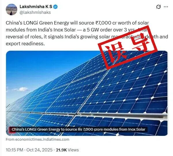 明查|网传中国从印度采购700亿卢比太阳能组件系误导,实则供应印度市场
