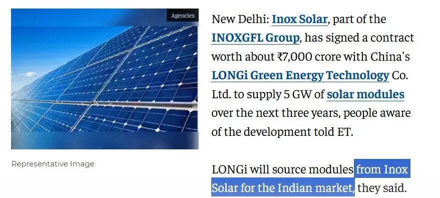 网传内容源自印度《经济时报》10月24日的报道,原文称“隆基与Inox Solar签署了一份价值约700亿卢比的合同,在未来三年内供应5GW太阳能组件。隆基将从印度Inox Solar采购组件供应印度市场”。