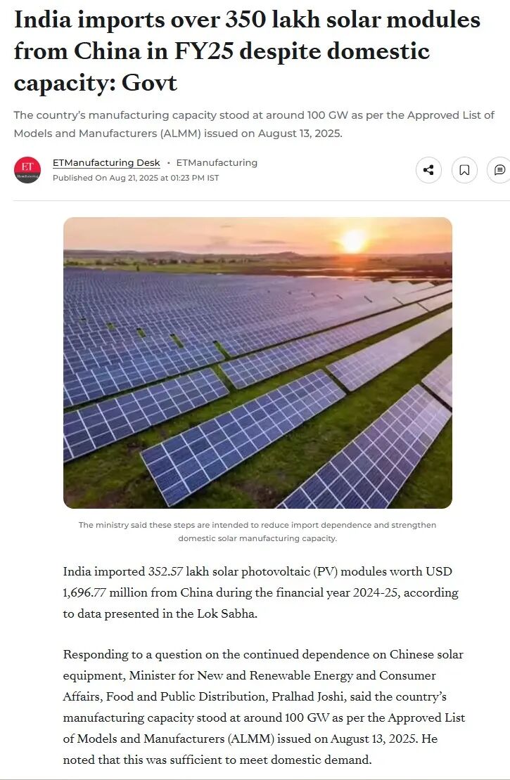 印度《经济时报》8月报道引用印度人民院数据指出,“尽管国内产能充足,印度在2024 - 2025财年仍从中国进口超过3500万块太阳能组件”。