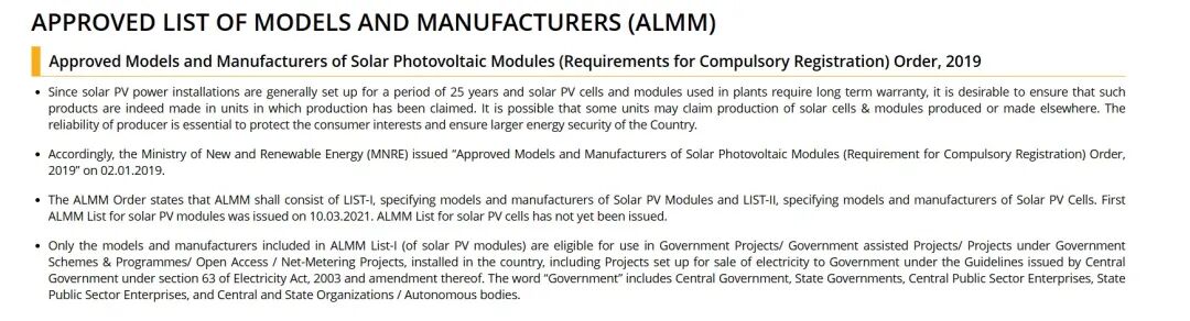 上述报道提及的ALMM清单是印度为减少进口依赖制定的,要求政府及资助项目须用本土组件,外国企业需采购本土产能才能进入获批清单。