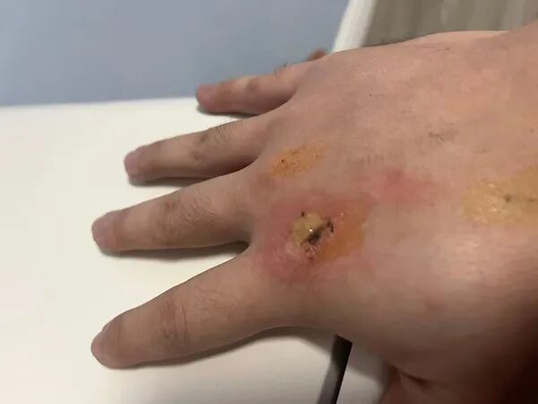 由于燃烧物四处飞溅,肖天阳双手均出现不同程度烫伤。他说:“手被烫到确实有刺痛感,但我也没多想,只想着将影响降到最低。”