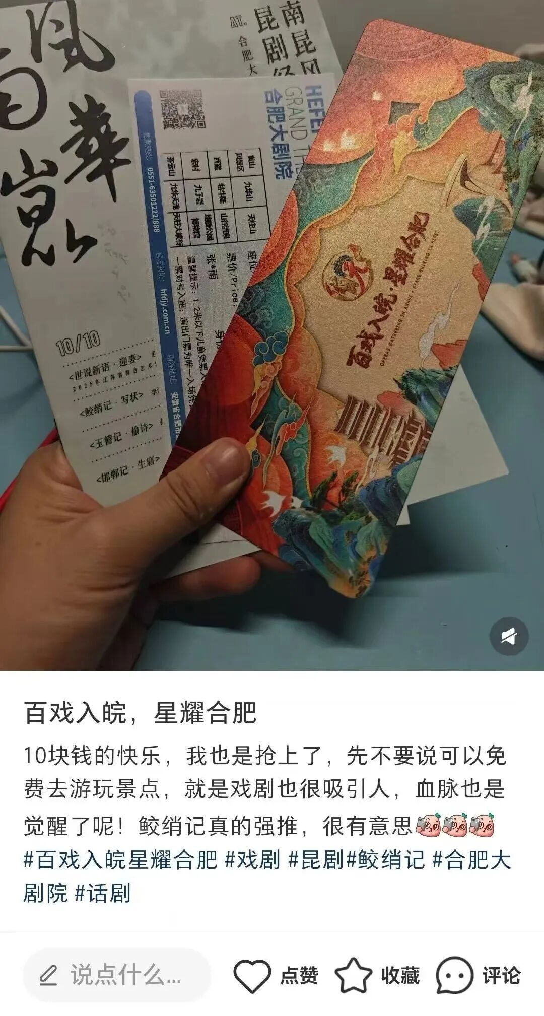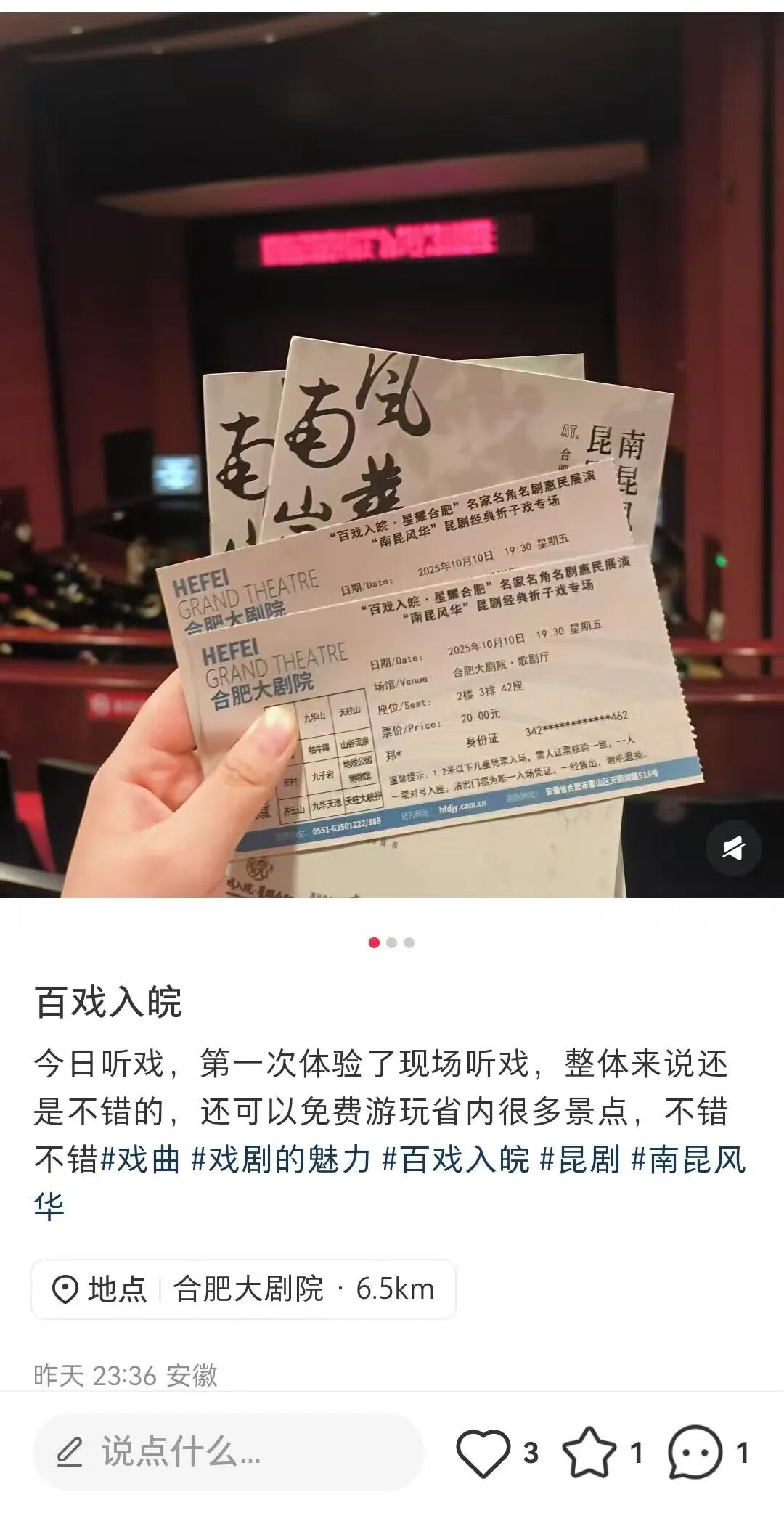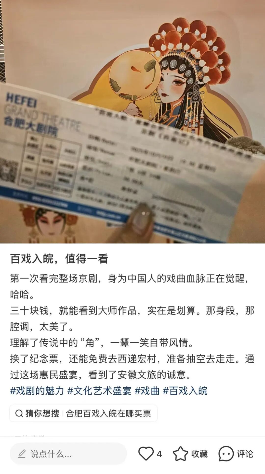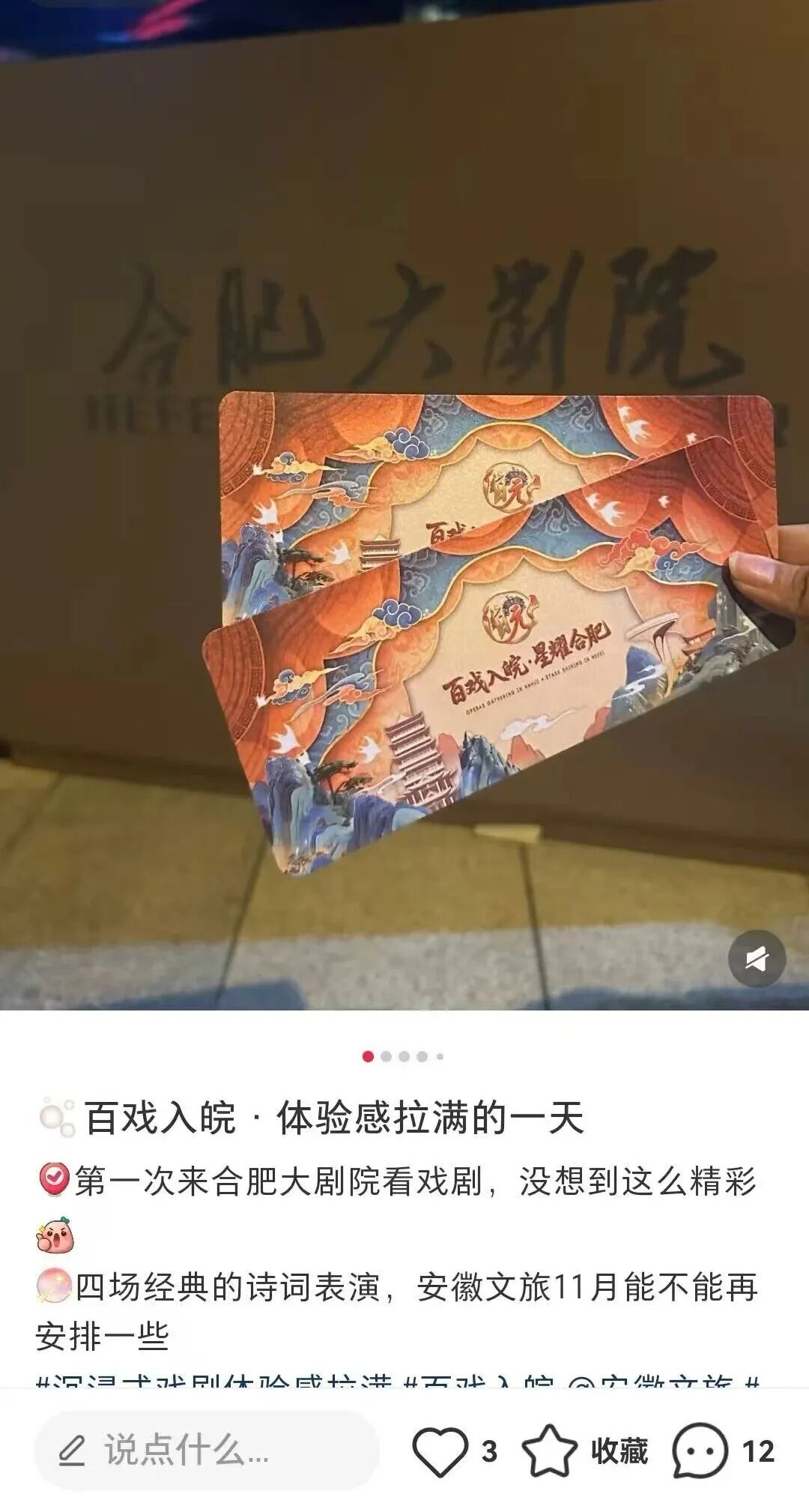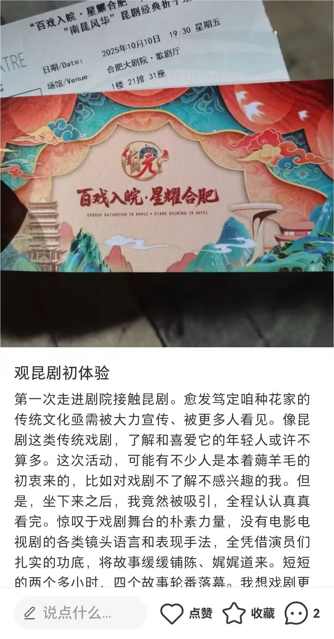 “原来不是戏曲不好听,是我从来没给过它机会!”在社交媒体上,“百戏入皖”成了热门话题。无数看戏的年轻人晒出戏票,分享着他们与戏曲“第一次亲密接触”后的震撼感受。