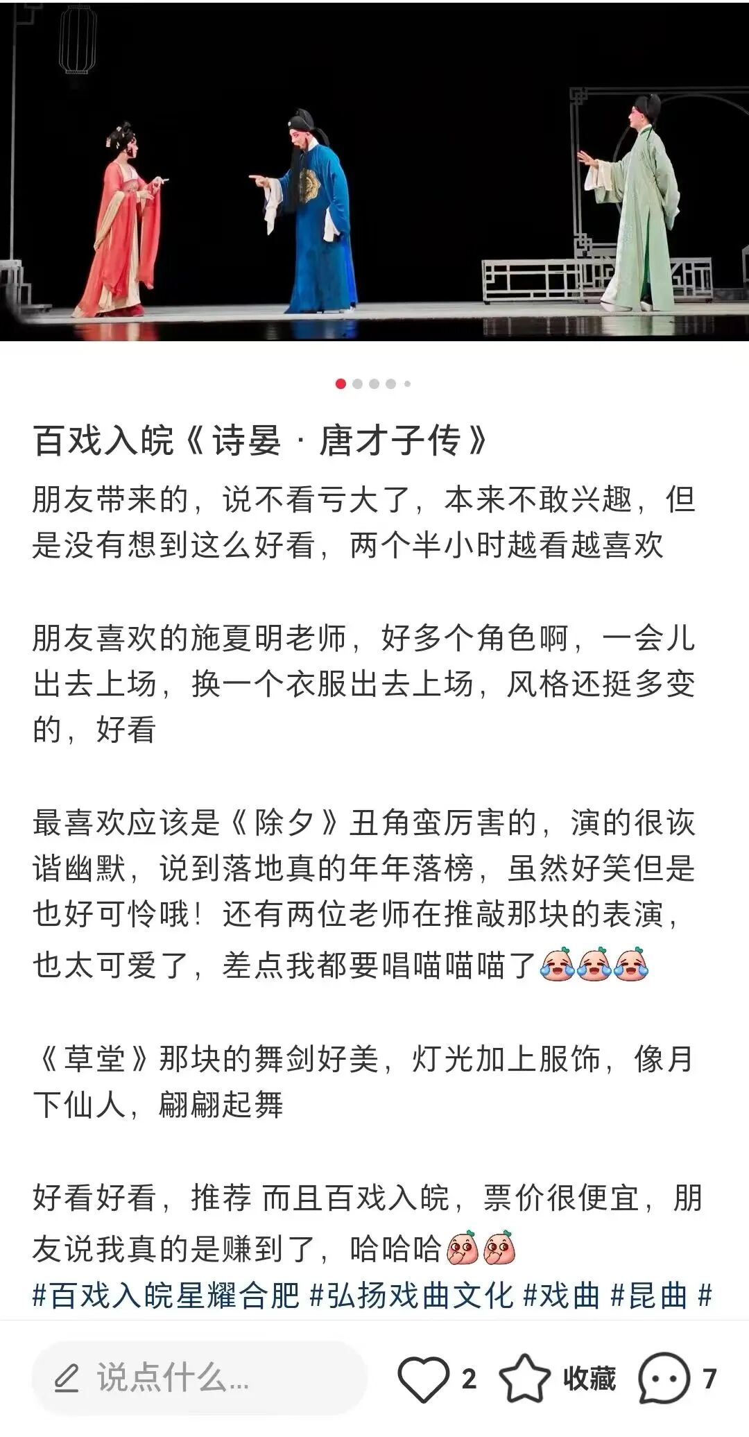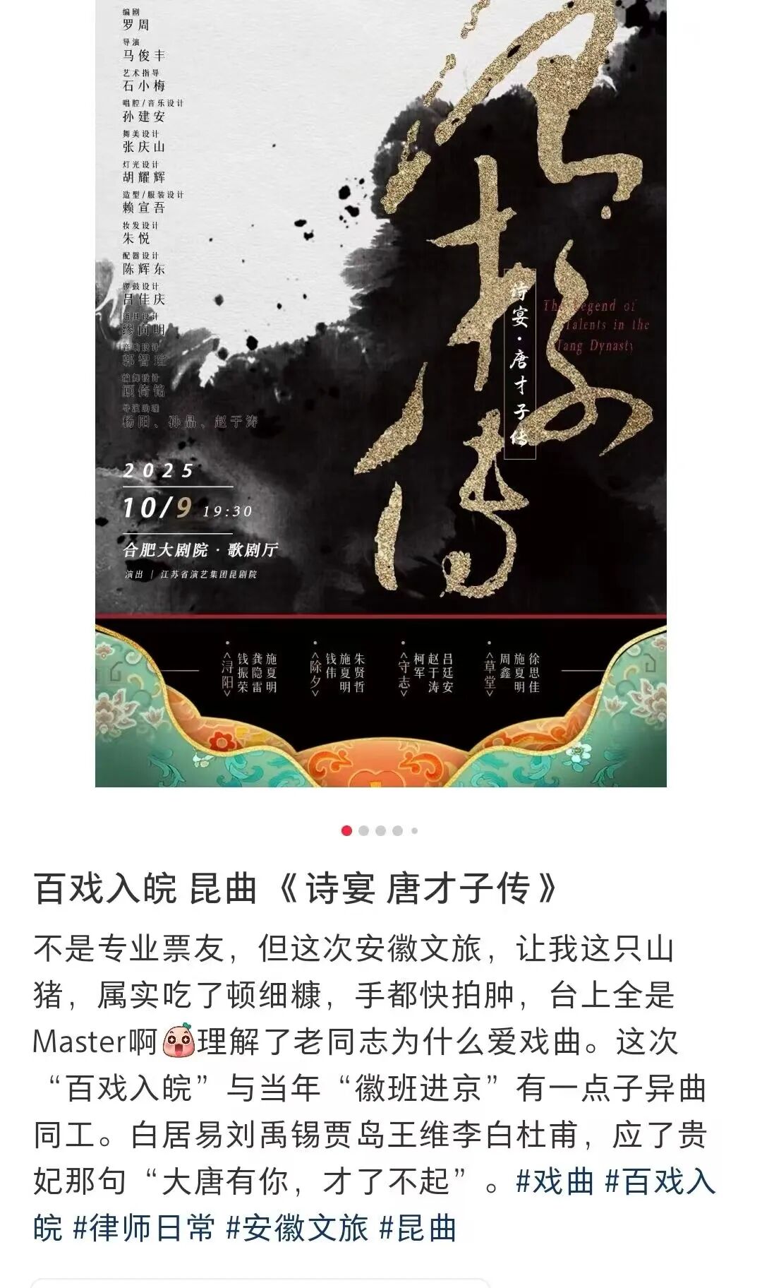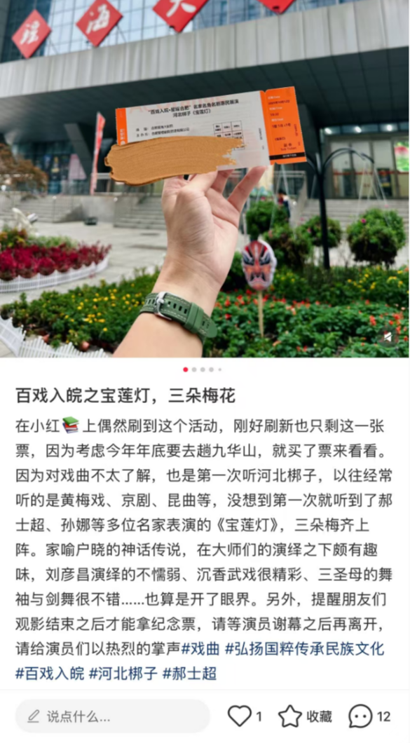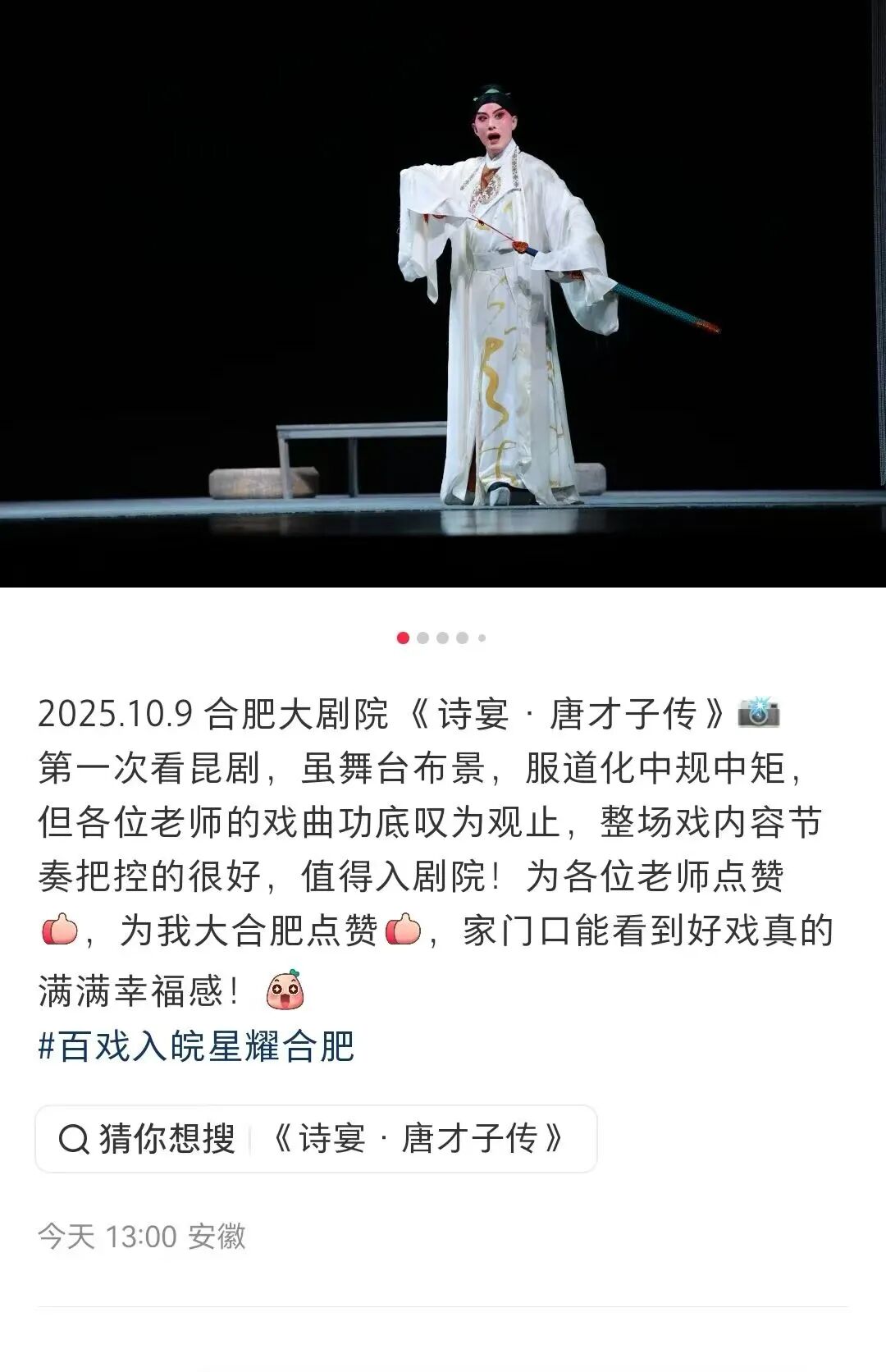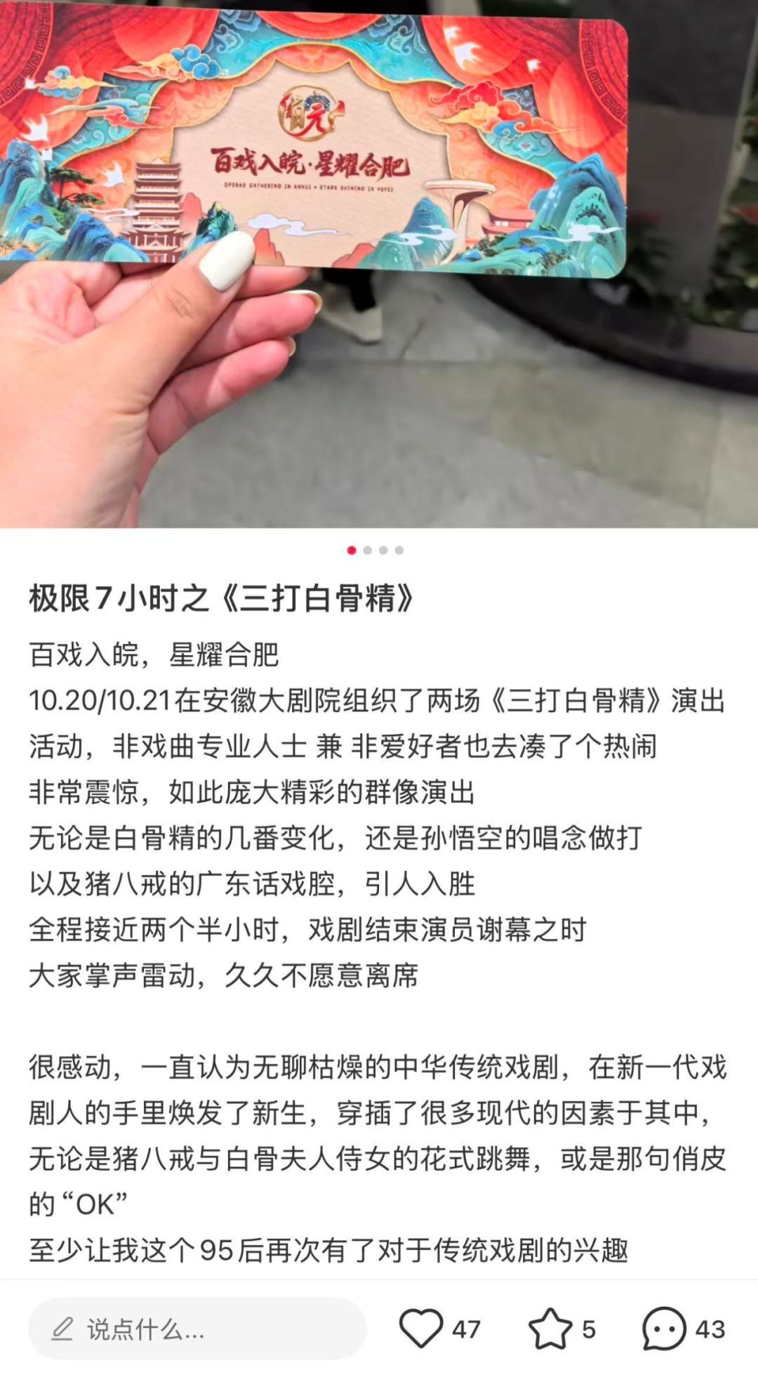 “原来不是戏曲不好听,是我从来没给过它机会!”在社交媒体上,“百戏入皖”成了热门话题。无数看戏的年轻人晒出戏票,分享着他们与戏曲“第一次亲密接触”后的震撼感受。