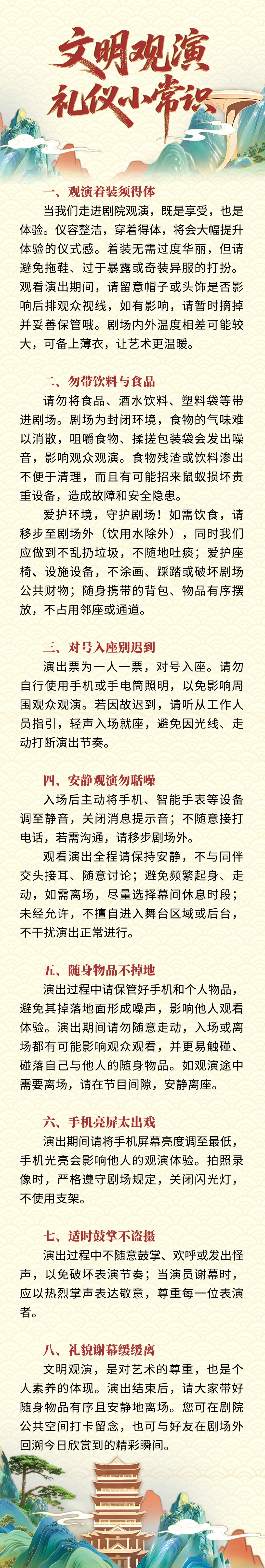 一场精彩的演出,是由剧院、艺术家、观众共同完成的作品。文明优雅的观演体验,更是这部作品的重要组成部分。近期演出热度持续上升,在此温馨提醒各位观众,务必文明观演。