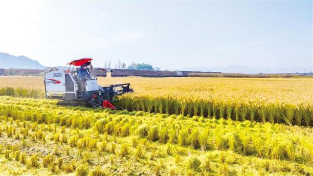 金秋时节,榆中县青城镇青香蒲高原水稻研究基地内呈现出一幅壮观景象。300余亩稻田宛如金色画卷,沉甸甸的稻穗把秸秆都压弯了,微风拂过,稻浪层层涌动。大型收割机在稻田中来回穿梭,伴随着轰鸣声,饱满的稻粒不断被收入粮箱。