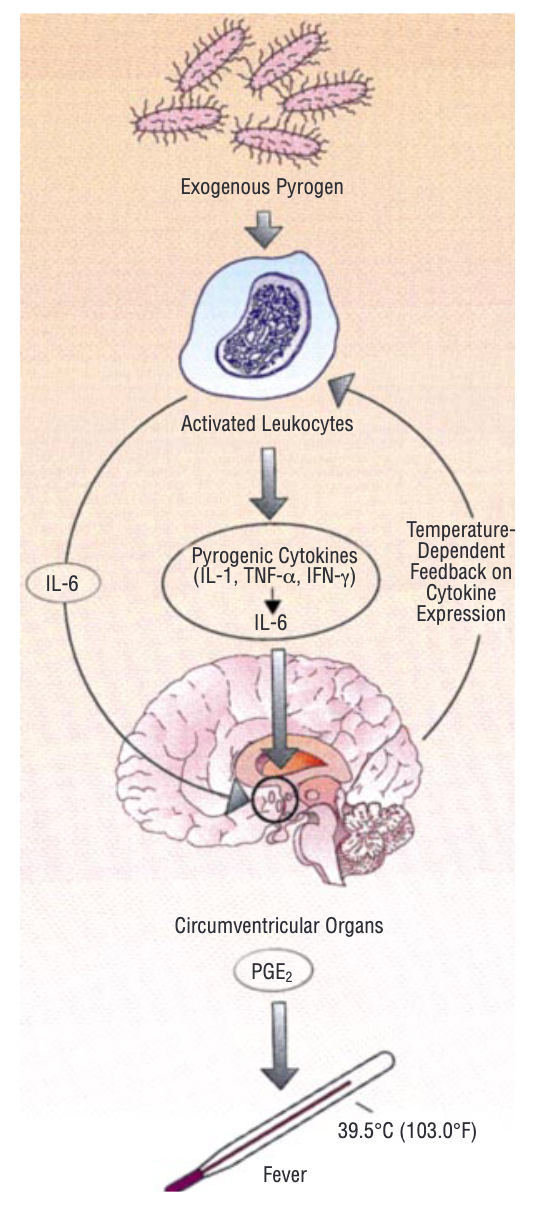 图注:发热反应的假设模型。IL 代表白细胞介素;TNF 代表肿瘤坏死因子;IFN 代表干扰素;PGE₂ 代表前列腺素 E₂。