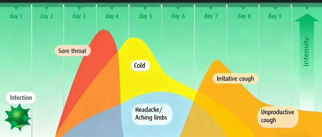 当我们感觉不舒服时,说明免疫系统已经开始战斗了。只有彻底打败敌人(病毒),这场战斗才会结束(症状缓解)。而战斗需要时间,甚至随着战斗加剧,症状可能会先加重,几天后才会逐渐减轻。