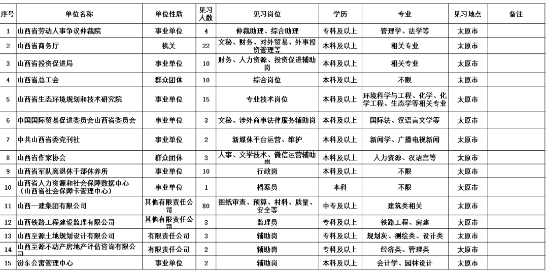 提供见习岗位的用人单位有省商务厅、省劳动人事争议仲裁院、省总工会、山西一建集团有限公司等15家机关、企事业单位和群众团体。见习地点都在太原市,涵盖仲裁助理、新媒体平台运营、人事、档案员等170个岗位,部分岗位不设专业要求。
