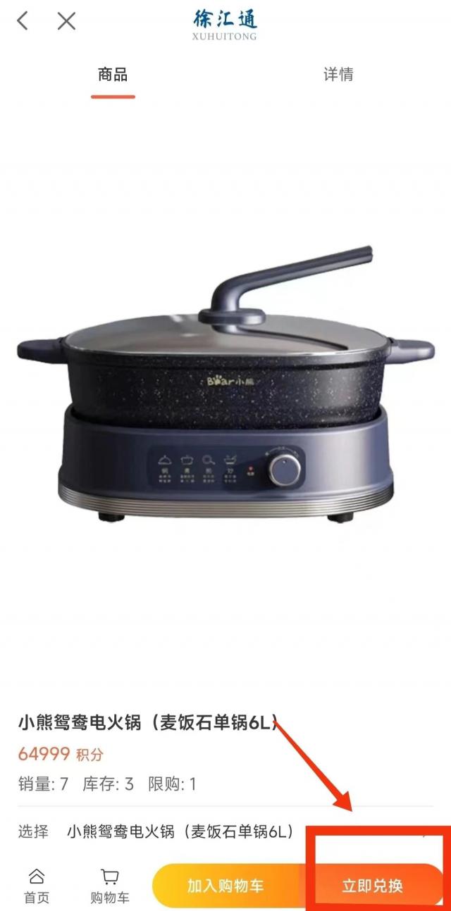 登录“徐汇通”后,点击右下角【我的】→点击【积分】→点击【积分兑好礼】→点击相关商品→点击【立即兑换】,即可进入兑换页面