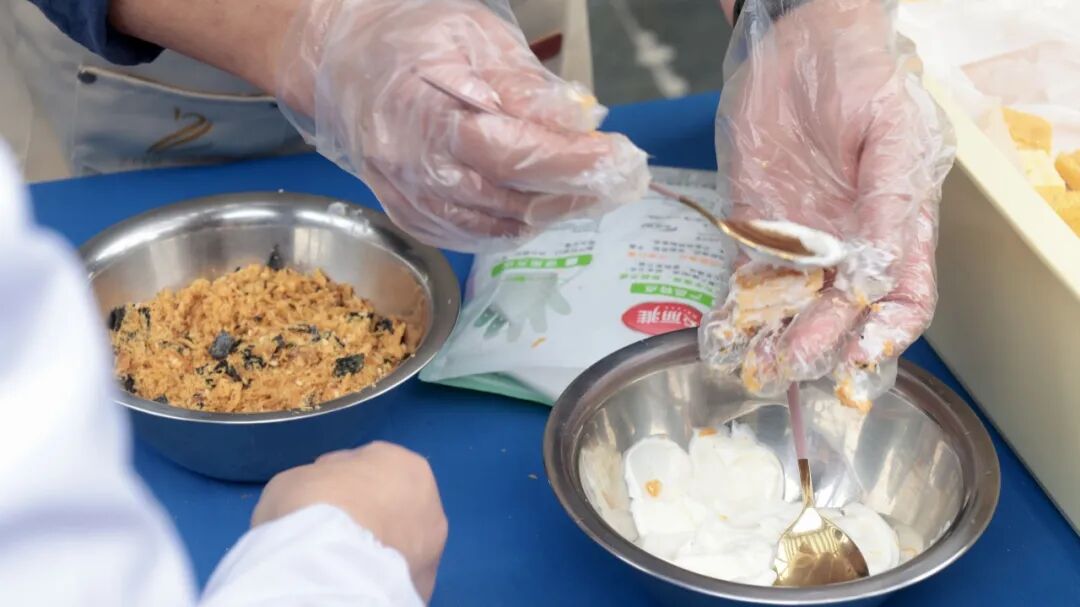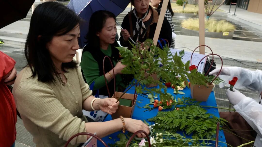 最受欢迎的是“职业技能体验”摊位。活动现场设有插花师、西点师和咖啡师三个特色体验区,每个区都围满了想尝试的群众。老师现场示范,从插花配色、西点塑形到咖啡拉花,一步步讲解、手把手指导。大家认真听、亲自做,沉浸感受职业技能的魅力,现场气氛热烈又充实。