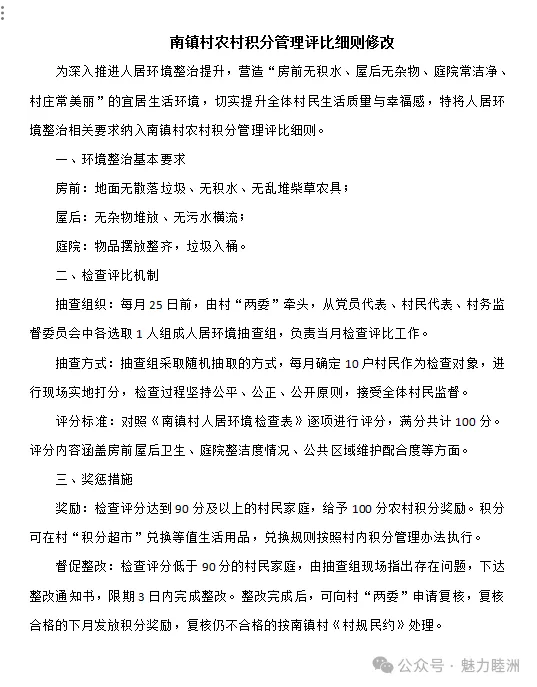 为了巩固整治成果,激发村民主动参与的热情,南镇村在党员大会、村民代表大会上全票表决通过,将人居环境卫生纳入南镇村农村积分管理,并同步推行“环境卫生积分管理”模式。该机制遵循“奖罚分明、动态管理”的原则,制定了详细的积分评定标准:对积极参与环境整治、家中整洁无积水、认领公共区域清扫任务的村民给予积分奖励;对卫生不达标的村民进行扣分提醒并督促整改。村民可以凭借积分到村内的“积分超市”兑换生活用品,让“小积分”成为推动“大文明”的有力工具。村民也从“被动整改”转变为“主动维护”,形成了共建共管共享的良好治理格局。