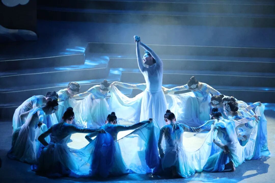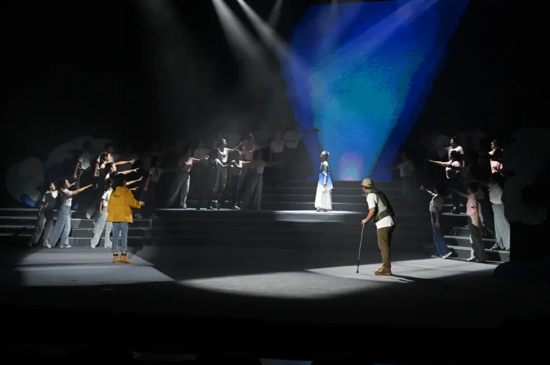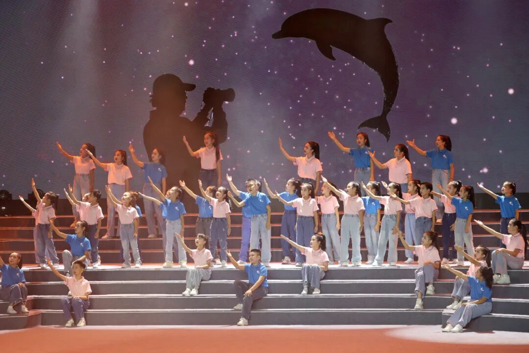 舞台上,演出以潘文石与潘岳扮演者的一段深情对话开场。《Long Long Ago》《期待的远方》《三娘湾,我们的家》等歌曲旋律悠扬,唱出了对家园的眷恋和对远方的憧憬;舞蹈《海的精灵》用柔美且有力的肢体动作,展现了白海豚的灵动与活力……演员们通过生动的表演、真挚的歌声和极具感染力的台词,将“钦钦”与人类之间的情感纽带刻画得入木三分。当剧情发展到人与海豚的离别与重逢时,不少观众悄悄擦去眼泪;而当保护行动逐步开展,希望重新照亮舞台时,现场又响起了持久而热烈的掌声。