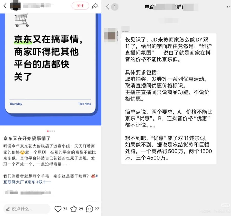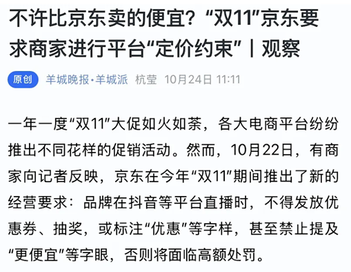10月23日前后,多家媒体关注到部分商家的不满,京东明确要求双11期间,商家在抖音等其他平台直播时,不得抽奖、发放优惠券或打出价格优惠标识等。