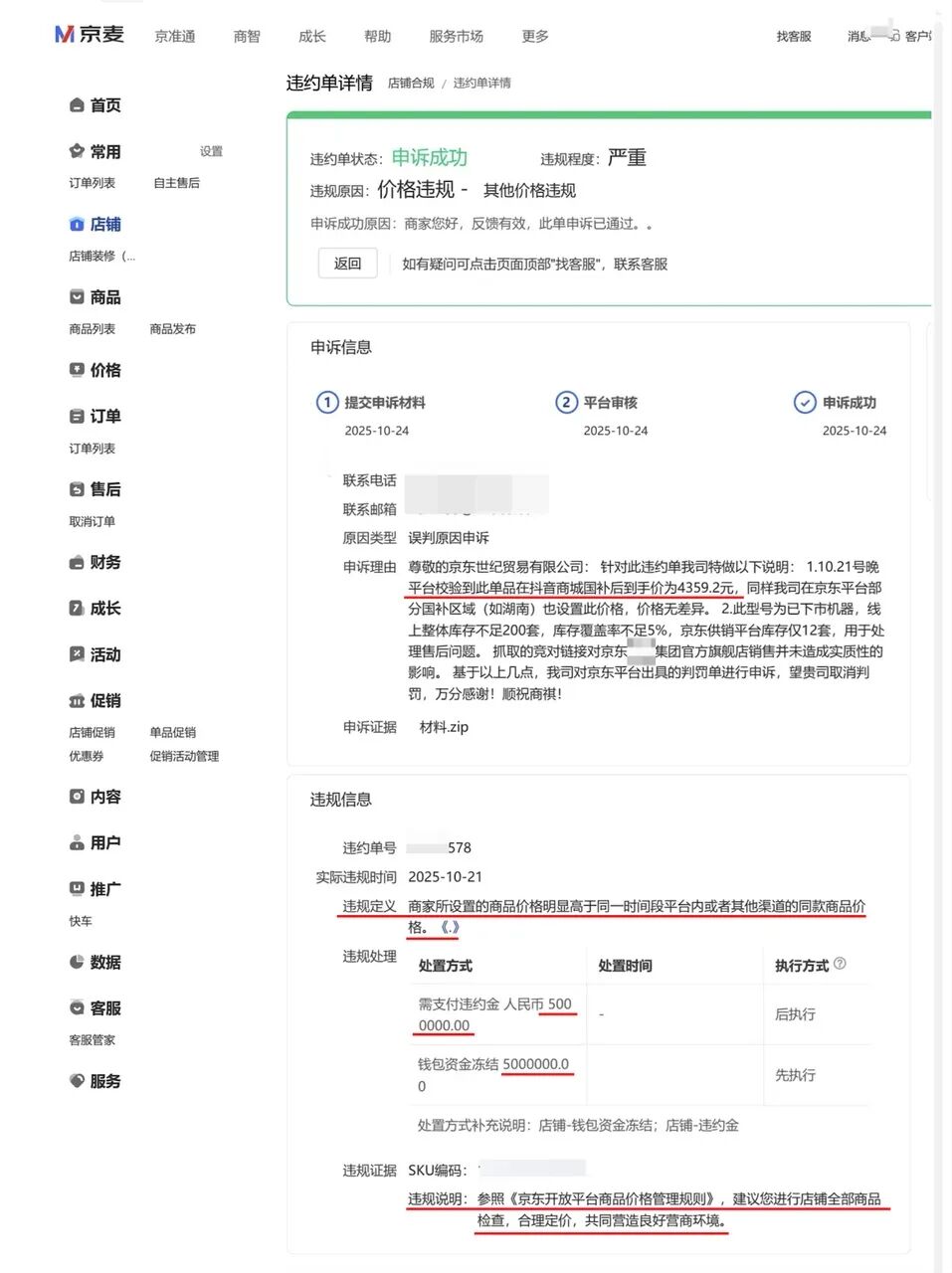 该截图印证了此前处罚截图的真实性,可见京东在10月21日确实向美的开出罚单,但美的在10月24日申诉,指出部分区域的京东售价与抖音一致,且“竞对链接”对京东平台未造成“实质性影响”,最终申诉成功,京东于同日撤销处罚。