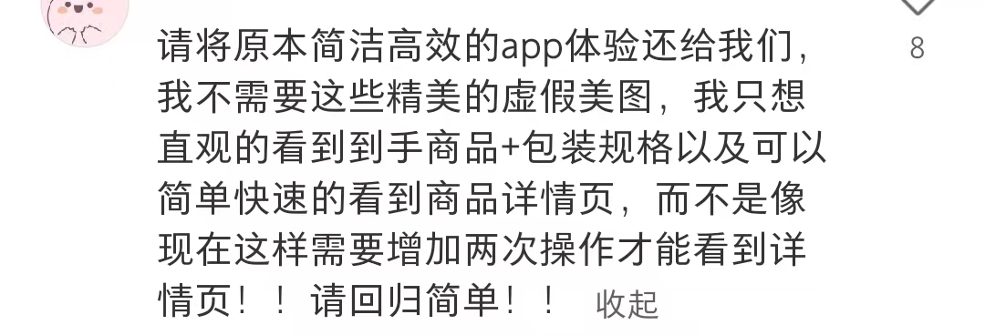 有用户直接表示“请把简洁高效的APP体验还给我们,我不需要精美的虚假美图”。