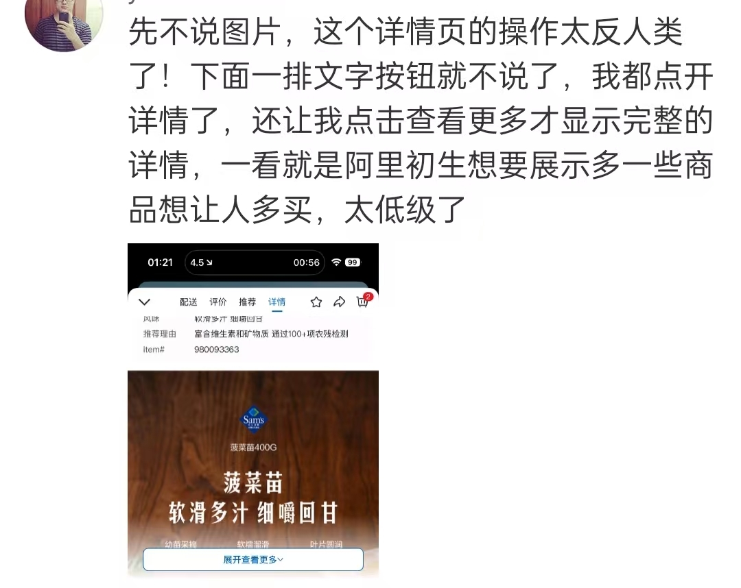 正如消费者吐槽:“详情页操作太反人类!下面一排文字按钮不说,点开详情后还得点击查看更多才能看完整信息”。