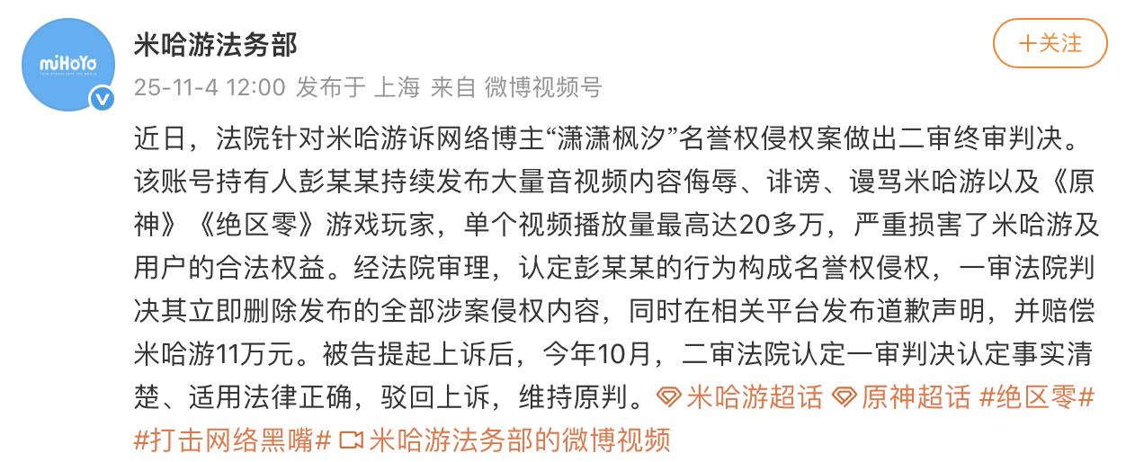 据米哈游介绍,账号持有人彭某某持续发布大量音视频,对米哈游以及《原神》《绝区零》游戏玩家进行侮辱、诽谤、谩骂,单个视频最高播放量达20多万,严重损害了米哈游及用户的合法权益。