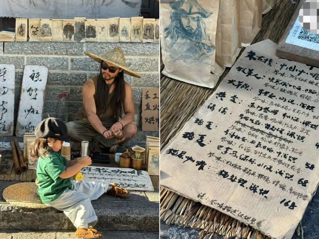 摊主一头长发,竹编斗笠遮面,随性地坐在石板路上。铜制手冲壶、竹制器具在麻织垫上错落摆放,身后布幔上“咖啡游侠”四个字与侠客画像格外醒目。