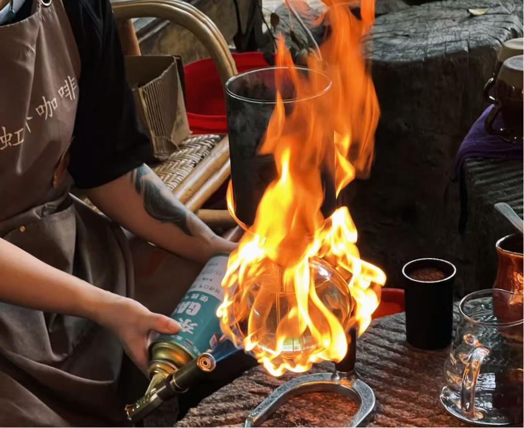 咖叔的“火烧咖啡”,实则是改造了传统虹吸壶咖啡的做法,把原有虹吸壶底部的热源改为喷枪喷射的明火。