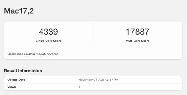 从常规性能看,M5芯片是苹果生态内的稳步迭代。在MacBook Pro中,它单核心成绩4339、多核心成绩17787,相比上一代M4芯片有一定提升。