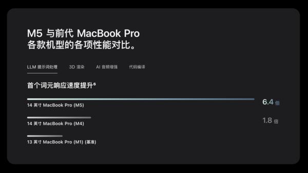 苹果官方称,M5芯片的图形处理器在AI峰值计算性能上较M4提升4倍以上,“LLM提示词处理”的首个词元响应速度显著提升。