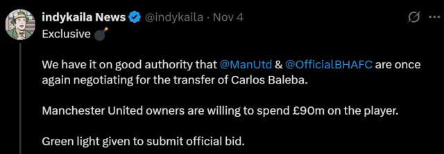 布朗指出,上个月曼联4 - 2战胜布莱顿的比赛中,巴莱巴没给潜在新东家留下好印象,还让人担忧。曼联赛季中途引进状态不佳球员没意义,而且吉姆·拉特克里夫爵士不会在冬窗花9000万英镑巨资。