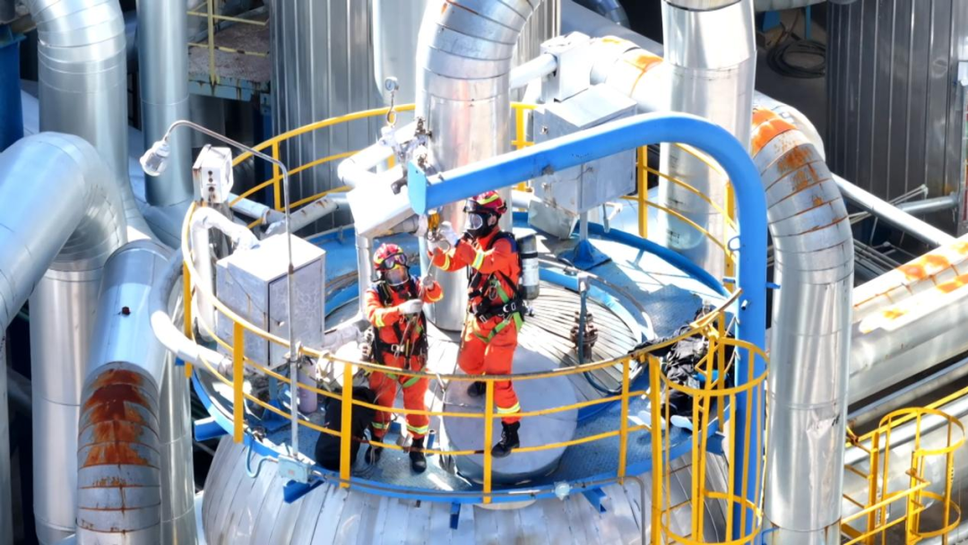 高处平台一氧化碳泄漏并引发火灾,有作业人员中毒昏迷。国能鄂尔多斯队运用高空绳索救援技术,快速将伤员转移到安全区域。国家应急医学救援队对伤员实施高流量氧疗,在稳定伤情后立即启动转运机制。
