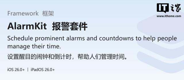 IT 之家援引博文介绍,该功能的技术基础是苹果在 iOS 26 系统中首次引入的全新 AlarmKit 开发框架。按照苹果官方定义,AlarmKit 旨在让各类 App 都能“安排醒目的闹钟和倒计时,以帮助人们管理时间”。