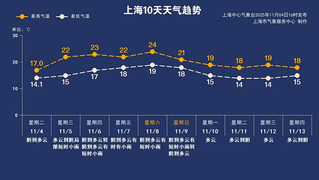本周上海以阴到多云天气为主,周四晚间至周日有弱降水过程,雨势不大,但建议出门带雨具。气温略有回升,周六最暖,最高气温可达24℃,周日起冷空气影响申城,风力增大、气温下降。
