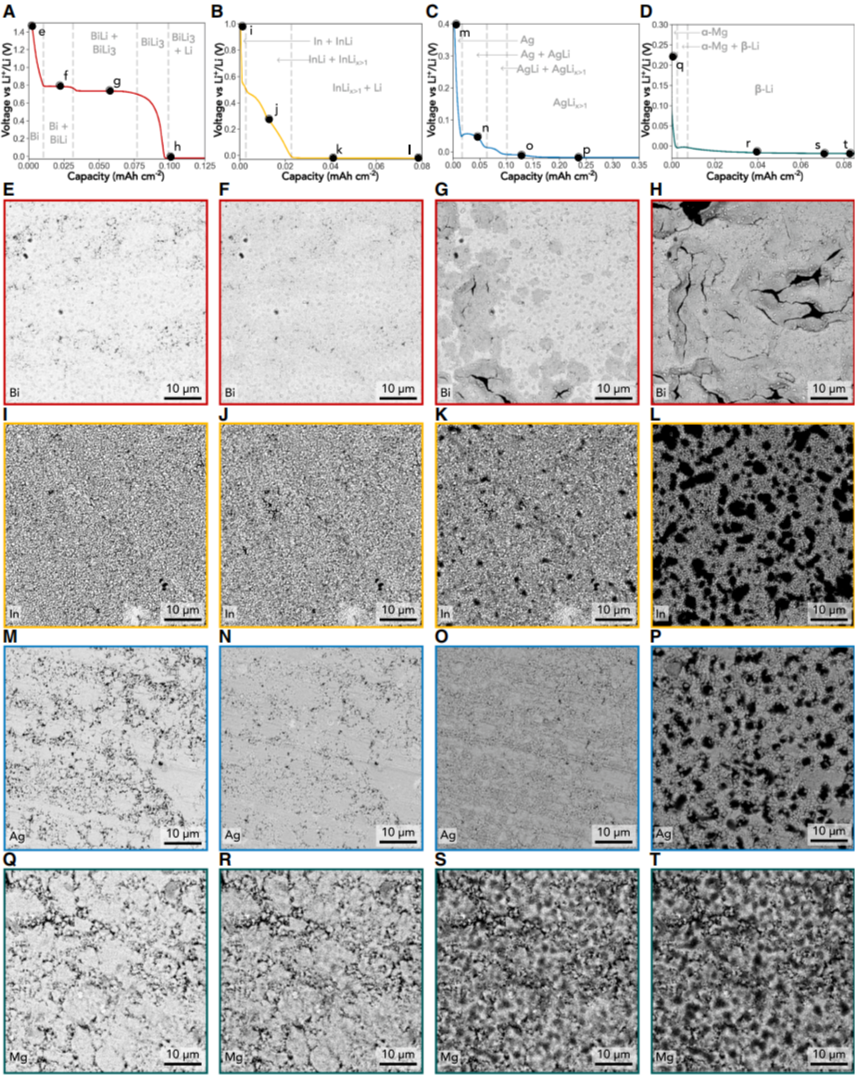 本文系统研究了铋、铟、银和镁四种金属夹层,这些元素因其与锂的二元相图特性被选中。镁形成两个固溶体相:富含镁的α相含高达15%的锂,富含锂的β相含超过31%的锂,镁合金能改善放电时的接触保持且很轻。银在α - Ag中有相当大的锂固溶度(高达45%的锂),在β - Li中含高达1%的银,Li - Ag系统相图复杂,有多种金属间化合物,相邻固溶体相晶体结构相似,固溶度范围为1% - 5%。铋和铟与锂固溶度有限,分别在组成范围两端形成具有快速锂离子传导相的金属间化合物(Li3Bi和InLi),铟可形成多达八种金属间化合物,铋仅形成两种。同时,通过定制的原位扫描电子显微镜(SEM)设置、三电极电化学测量、库仑滴定时间分析(CTTA)和原位X射线光电子能谱(XPS),研究夹层材料的锂化行为对锂沉积动态和界面稳定性的影响。