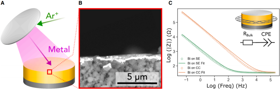 为研究溅射位置差异,用铋夹层在两种配置中制备三电极电池。图2C显示,铋层在两种情况下都表现为阻挡电极。夹层情况下电容比功能化集流体情况下高出约35倍,说明夹层情况下接触面积是功能化集流体情况下的35倍。这种直接比较揭示了沉积位置对电化学接触面积的影响。直接在固体电解质上沉积能确保金属夹层完全贴合固体电解质表面,提供完整电接触,增加活性面积,大幅降低与裸固体电解质相比的有效电流密度。高局部电流密度会导致锂枝晶形成,多次循环会导致短路,还会因SEI生长增加锂消耗。
